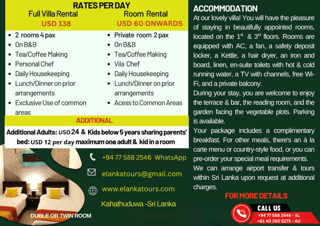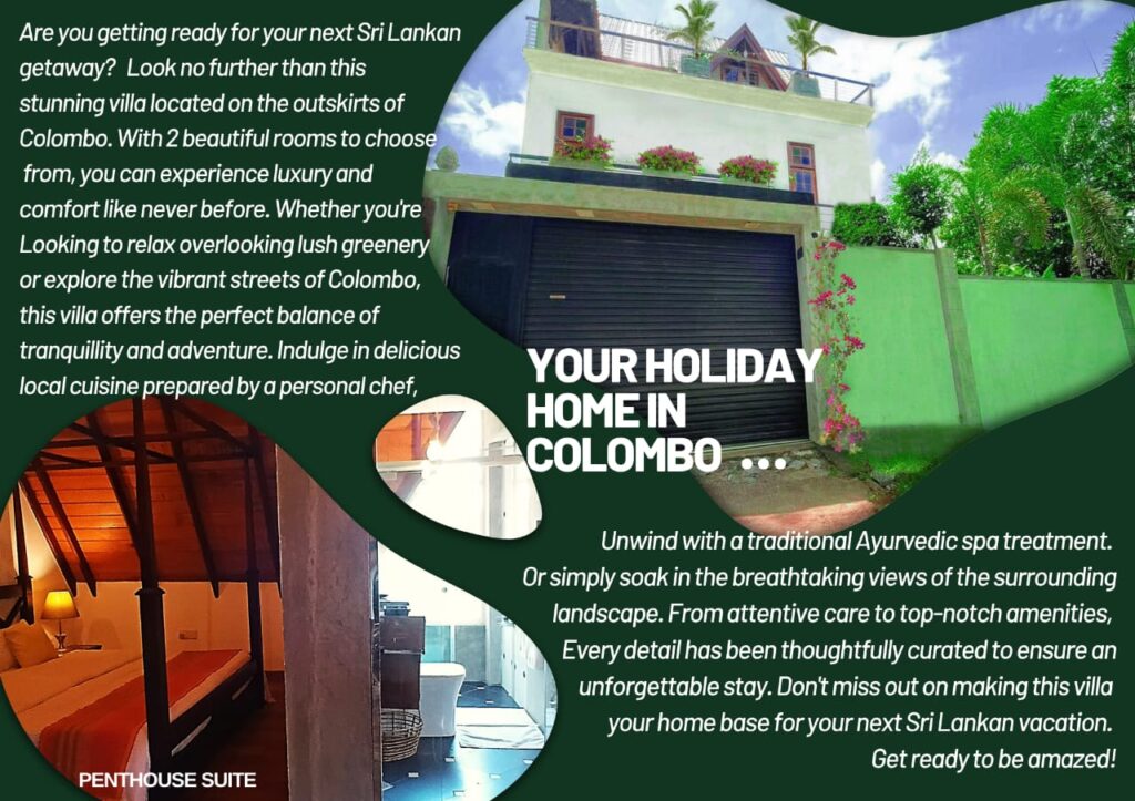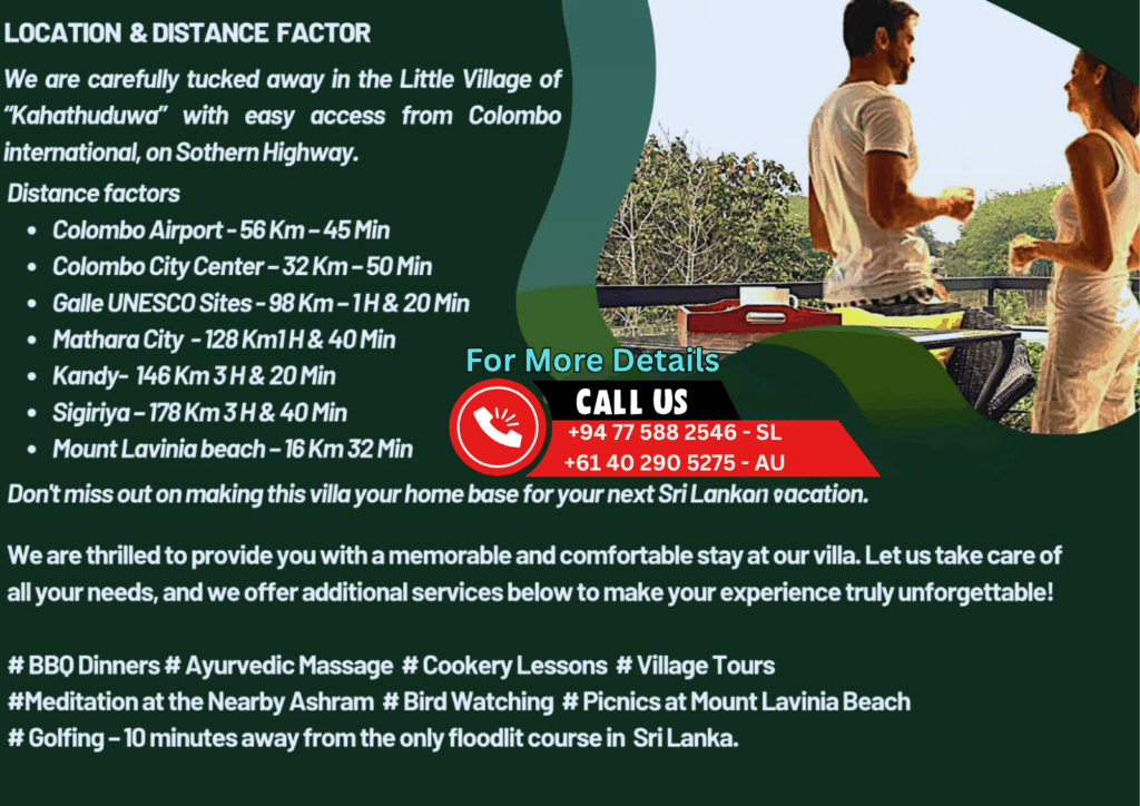 Welcome to Holiday Home @ Kahathuduwa Colombo Sri Lanka : Nestled in the charming town of Kahathuduwa, Sri Lanka, our country getaway offers a serene escape just 26 km from the bustling heart of Colombo. Experience the tranquility of lush countryside living, while remaining conveniently close to Colombo’s business facilities.